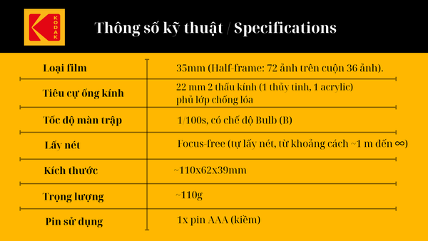 Định dạng phim: film cuộn 35mm (Half-Frame – nửa khung hình) → cho phép 72 ảnh trên cuộn 36 khung.